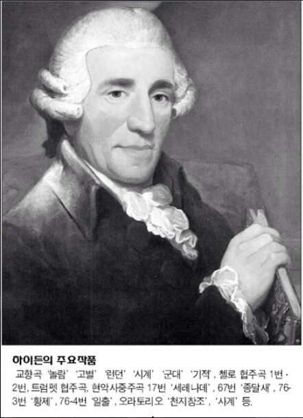 그 당시 ‘새로운 음악’이던 교향곡이 150편, 현악 4중주 곡이 70편, 그 밖에 거룩한 종교음악로부터 영주의 식사 때마다 연주하는 ‘식탁음악’에 이르기까지 그 수효는 실로 방대하다. ‘인생은 심각하게, 그러나 예술은 즐겁게’라는 전제군주시대의 예술풍조는 작곡가로 하여금 왕후귀족이 식후에 먹는 신선한 과일처럼 음악을 생산케 했던 것이다 – 신성 로마제국, 에스테르하치 카란타의 공작 바울 안톤 각하 밑에서. ‘교향곡의 아버지’로 불린 하이든에게 약간 어울리지 않는 아이러니한 고용주와 고용인의 관계가 아닌가 싶다.